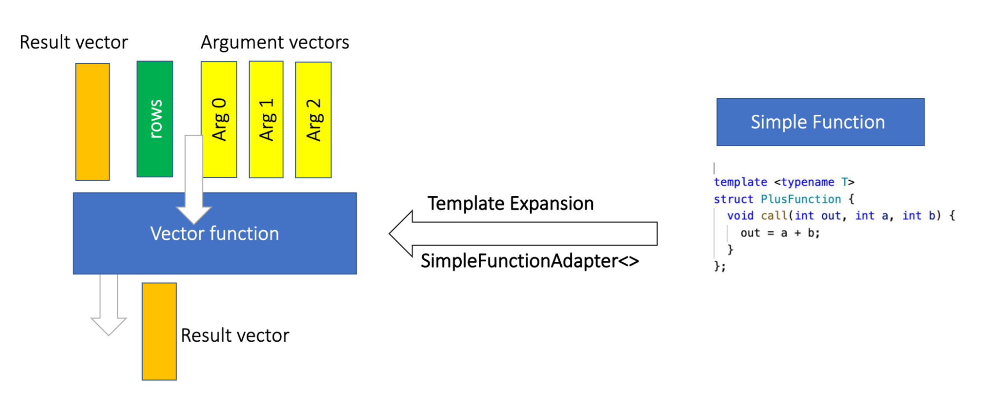 Writing functions through the simple interface mitigates the previously mentioned drawbacks, and significantly simplifies the function authoring process. For example, to add the function plus the user only needs to implement the PlusFunction struct shown in the graph above , which is then expanded using template expansion to a vector function.