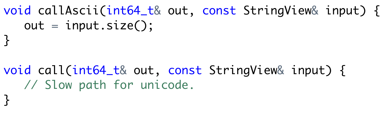 Functions with string inputs can be optimized when the inputs are known to be ascii. For example the length function for ascii strings is the size of the StringView O(1). But for non-ascii inputs the computation is a more complicated O(n) operation. Users can define a function callAscii() that will be called when all the string input arguments are ascii.