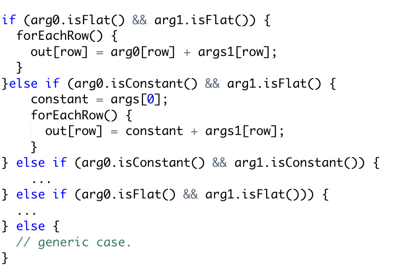 In the code above, the overhead of checking the encoding is switched outside the loop that applies the functions (the plus operation here). And the inner loops are simple operations that are potentially simdizable and free of encoding checks. One issue with this optimization is that the core loop is replicated many times. In general, the numbers of times it will be replicated is n^m where n is the number of args, and m is the number of encodings.