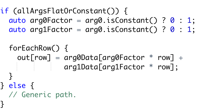 In this blog post, we will talk about some of the general optimizations that we have in the adapter, the optimizations discussed in this post make the performance of most simple functions that operates on primitive types matches their counter optimized vector function implementations. In the next blog post, we will discuss complex types in simple functions.