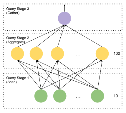 We have finally walked through the distributed execution of a simple query. We presented how data is partitioned between workers in the cluster, and then a second time over inside each worker.