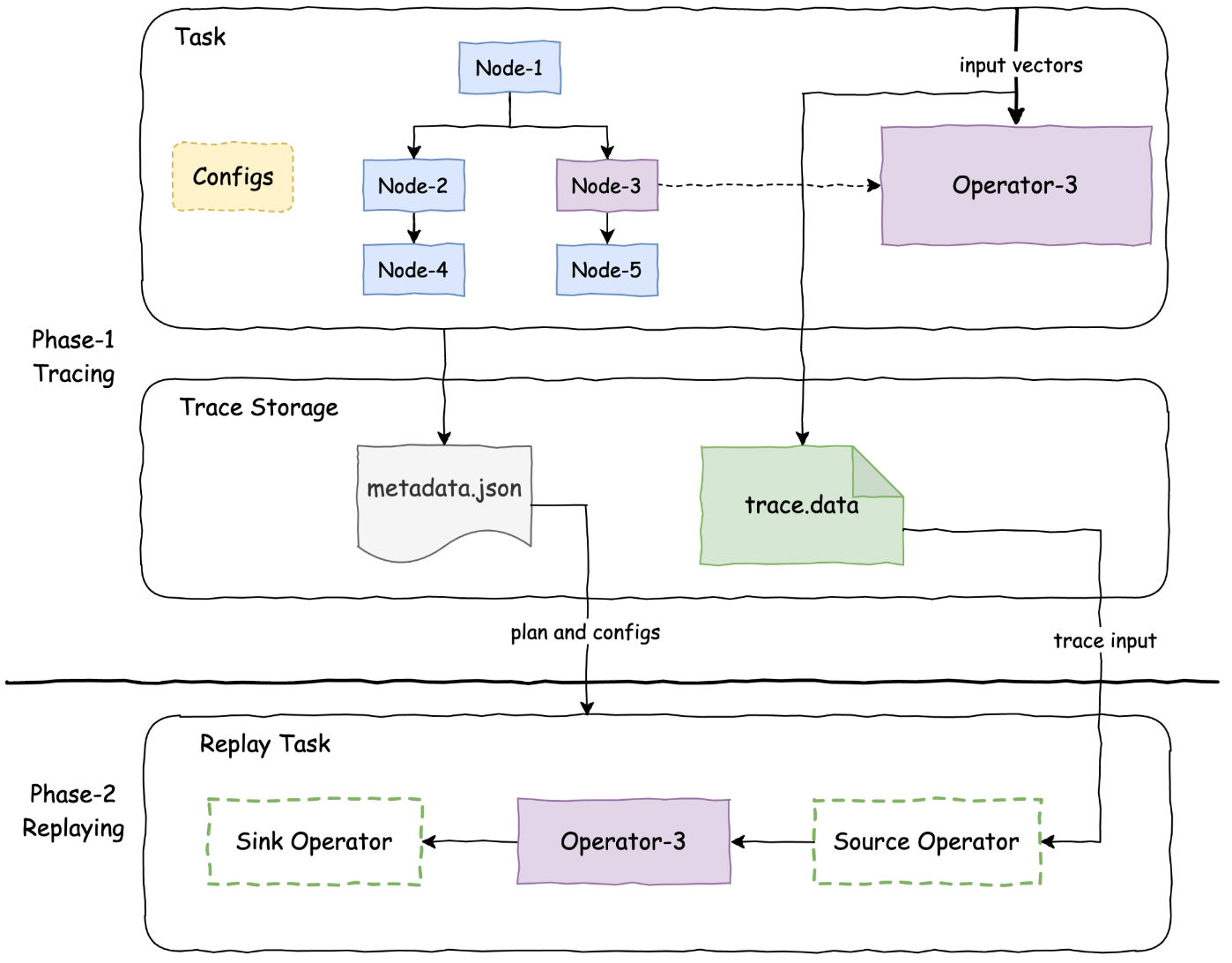 • The OperatorTraceInputWriter records the input vectors from the target operator, it uses a Presto serializer to serialize each vector batch and flush immediately to ensure that replay is possible even if a crash occurs during execution.
